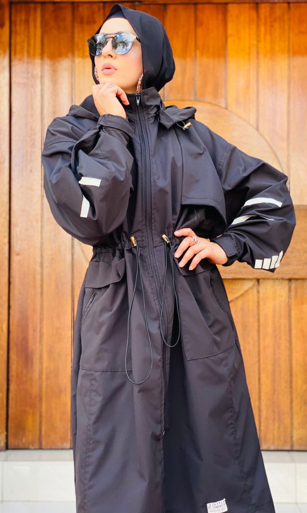 Premium Details: Contrast zips, high-neck protection, and a flowy longline cut for a polished, modest finish.