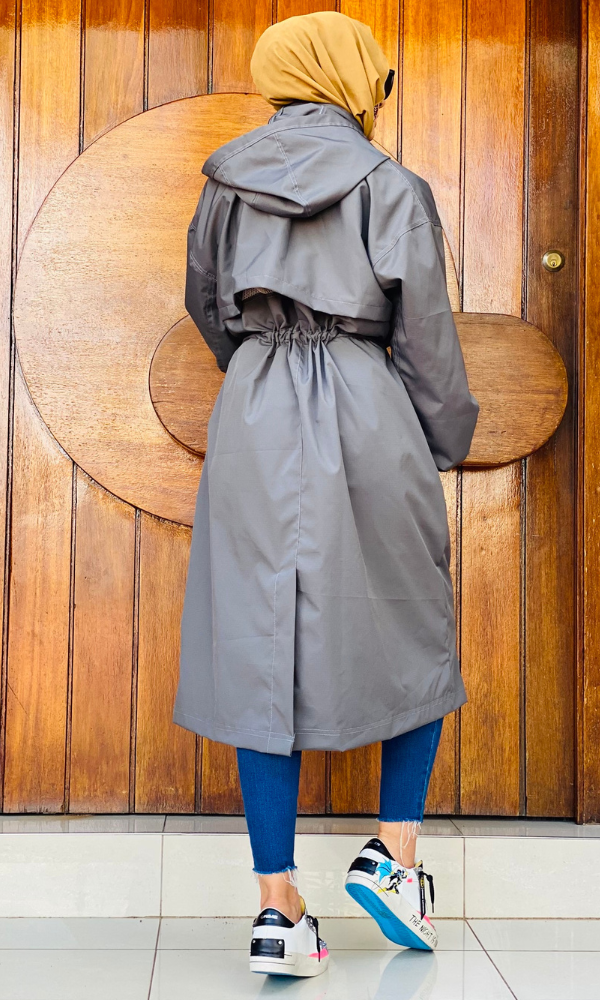 Premium Details: Contrast zips, high-neck protection, and a flowy longline cut for a polished, modest finish.